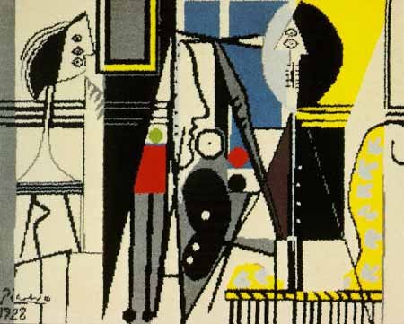 | 'The painter and his model' is a very frequent subject in Picasso's works. This painting has written on it: Paris-1928. The original -oils on linen- canvas measures 163x129.8 cm. It can be seen in the Museum of Modern Art in New York.This is the unique collection of Picasso carpets, rugs and tapestries. A very limited edition. Each piece is numbered and comes with its own certificate. Colour and form of a number of works from the famous master Pablo Picasso have been translated into rugs of the highest quality. Woven in the traditional way, and made of pure new wool. The result is a collection of exceptional class, designs with Pablo Picasso's personal signature. Each Picasso rug gives the most artistic expression to each individual interior. Masterful elegance for exclusive interiors. This collection is realised with the direct cooperation of Spadem, whom are representing the heirs of Picasso. |
